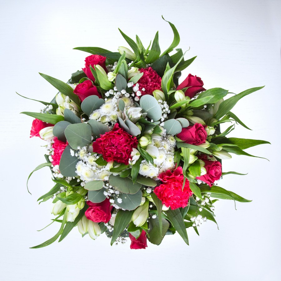 Celebrate beauty and elegance with our Luxurious Red & White Bouquet. This captivating arrangement combines rich red roses and carnations with delicate white chrysanthemums and gypsophila, all thoughtfully arranged with white alstroemeria and aspidistra leaves. Each flower is hand-selected to ensure freshness and quality.