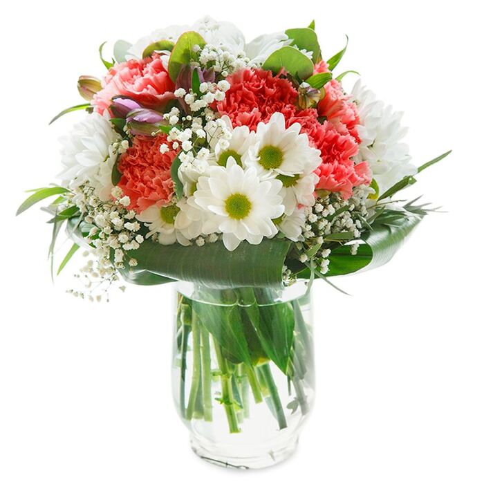 There is a lightness and energy in this bouquet that perfectly echoes the vibrant life of Bishop's Stortford-each detail a loving nod to the town's parks and market squares. Carefully arranged in a sleek white gift bag with elegant ribbon handles, the bouquet is a tapestry of coral and peach carnations, every ruffled petal exuding softness and inviting a sense of joy, like the first warm days in Southern Country Park. Crisp daisies, glowing with golden-lime centers, add an uplifting contrast, while gentle sprays of baby's breath weave throughout, casting a dreamy softness over the composition. On the left, glimpses of purple-tipped buds bring curiosity and the whisper of blooms to come, echoing spring's arrival along the banks of the River Stort. Encircling it all, glossy deep green leaves provide a rich, living backdrop and a subtle fresh scent, much like the well-kept hedgerows that edge the town. The professional floristry shines in the bouquet's perfect fullness and harmonious balance. Ideal for birthdays, new beginnings, or a spontaneous gesture of cheer, this bouquet makes the perfect gift to brighten any home from Thorley Park to the heart of Bishop's Stortford, delivered with the warm expertise and pride of your local community florist. Bursting with the optimism of a Bishop's Stortford spring, this bouquet is artfully presented against a clean white backdrop, inviting attention to every fresh detail. White daisies, with golden-green centers, form the luminous heart of the arrangement, surrounded by soft, coral-pink carnations whose layered ruffles bring depth and lively motion. Clouds of tiny white gypsophila blossoms float among the larger flowers, their delicacy evoking early morning light over Jackson Square. Hints of alstroemeria buds, streaked with soft purple and deep pink, peep from the greenery, adding gentle sophistication and intrigue. Eucalyptus leaves and a medley of deep green foliage frame the bouquet, creating balance and fresh contrast. Every stem is thoughtfully placed by local Bishop's Stortford florists, resulting in a harmonious, rounded shape that speaks of joy and gentle celebration. Perfect for birthdays, kind gestures, or moments when you want to brighten up a home near Rye Street, this bouquet celebrates the best of local skill, nature, and heartfelt connection. This joyful bouquet radiates uplifting cheer and simple elegance-the embodiment of Bishop's Stortford in bloom. At its heart, lush coral carnations unfurl in soft waves, each bloom textured and inviting, drawing both attention and delight as they reflect the clarity of light across the arrangement. White chrysanthemums bring fullness and stately grace, anchoring the design with a gentle strength. Interspersed between them, playful white daisies with striking green eyes evoke the freshness of the local Hertfordshire countryside on a morning walk near Bridge Street. Wisps of baby's breath lend a soft fineness, as if early mist is hovering above the showy blossoms, while several closed alstroemeria buds glow with magenta on the bouquet's edge, hinting at the promise of even more colour to come. A mix of broad, glossy green leaves and slender, lively foliage wrap the flowers with a sense of harmony, reminiscent of the natural flow found along the River Stort towpath. All this rests in a clear glass vase, fresh water preserving the stems and boosting the sense of rural vitality. Lit evenly and naturally, every colour and contour is highlighted, inviting a sense of renewal, gratitude, and joy-making it the perfect choice for commemorating birthdays, sending thanks, or celebrating life's new chapters anywhere in Bishop's Stortford.